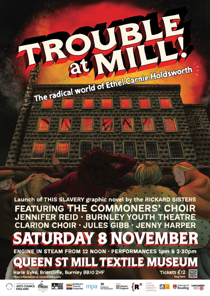 This immersive spoken-word and song spectacular was the national launch event for the Rickard Sisters’ new graphic novel adaptation of Ethel’s radical story This Slavery, the event was created and produced by them and included contributions from the Commoners Choir (with a new song commissioned from Boff Whalley); the East Lancashire Clarion Choir; performers from Burnley Youth Theatre; Jennifer Reid and Jules Gibb. The Rickard Sisters also created the Ethelibition, a brand new exhibition about the life and work of Ethel Carnie Holdsworth, made in collaboration with Pendle Radicals PhD candidate Jenny Harper and Dr Nicola Wilson from Reading University. It included a life-size recreation of the Martin’s family kitchen from This Slavery, so people could sit inside the book and feel what it was like to live and work in a 1910s mill town.